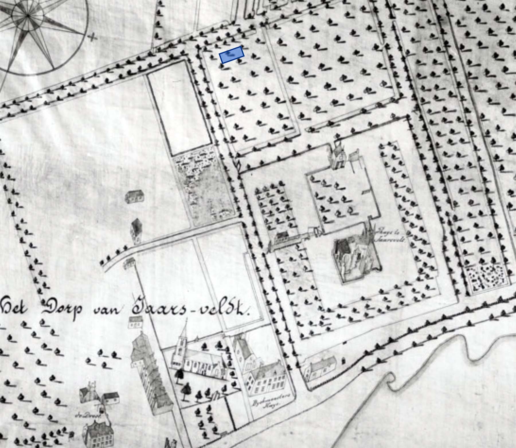 Ter oriëntatie: blauw vierkant is de huidige locatie van het herenhuis